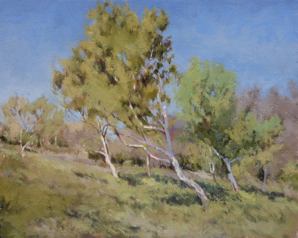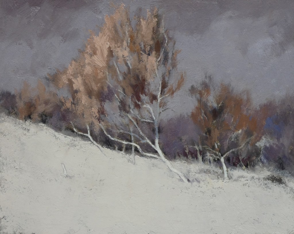 There’s a lack of silver birch trees in these parts. They lend themselves to painting, just look at Russian art, apparently you can’t step outside the dacha without smacking your nose into one. Their white bark stands out nicely against the green and the shadow of woodland. At Warren Glen in Hastings Country park however, where the ponies and Galloway cattle hang out, at the bottom by directional bollard 21, are a few decidedly pale trees. No idea if they’re birch trees or what but they’re making some aesthetic effort so I’ve photographed and painted them many times, in all three of our seasons in fact, spring, autumn and winter.